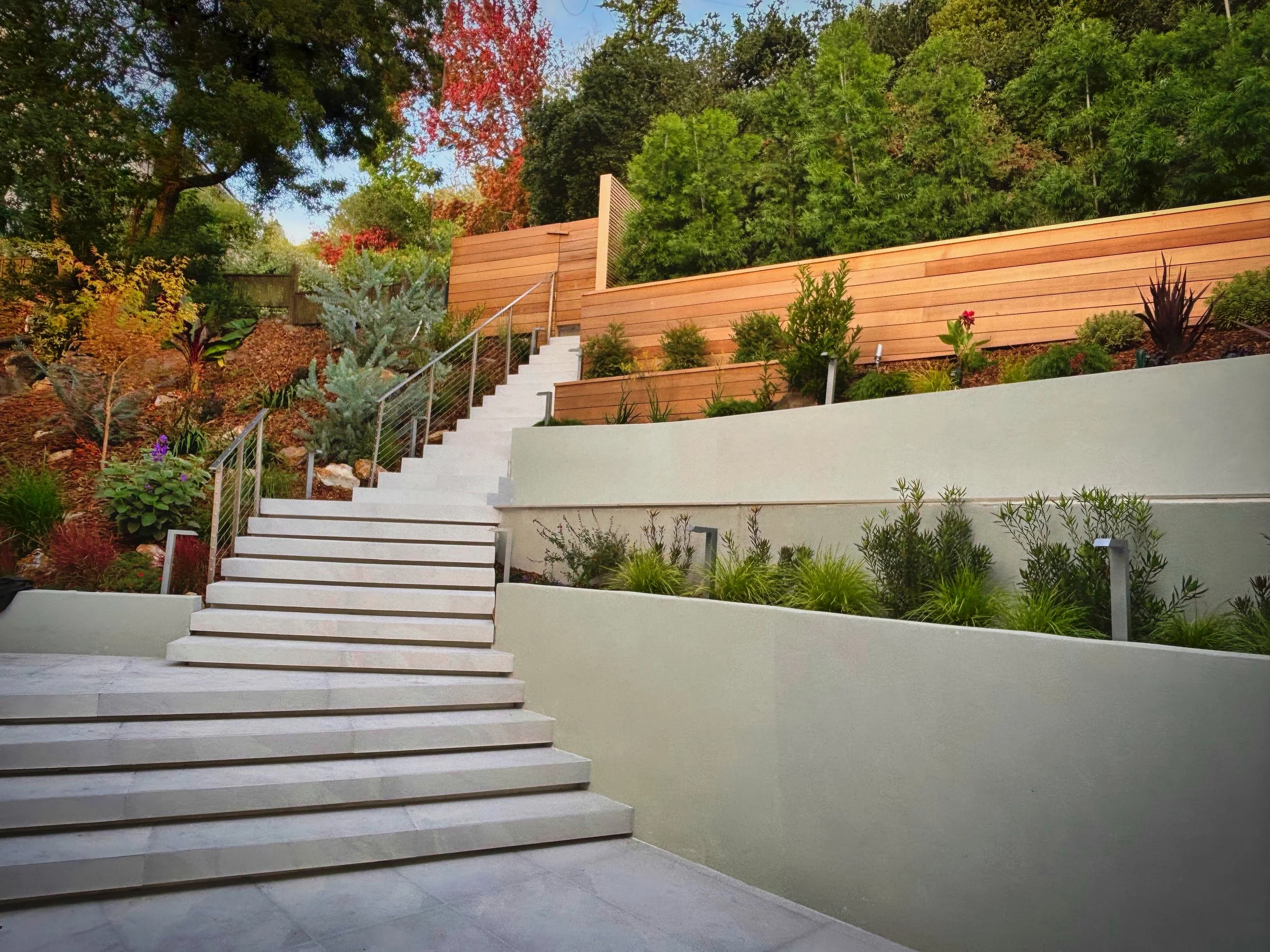 This hillside project transforms limited space into a multifunctional outdoor environment that balances dramatic design with practical engineering. Cascading staircases lead from the roadway down to the property, their flowing lines echoed by modern glass partitions that contrast the corrugated steel and dark wood of the structure. Lush planting and carefully selected color create a striking entrance despite the site sitting beneath the road.